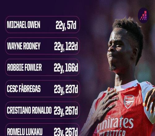 在与西汉姆联的比赛中,萨卡打入一球,达成英超生涯参与100球里程碑(55球45助),据统计,24岁29天的萨卡是英超历史...