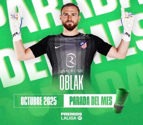 官方消息,马竞门将奥布拉克对阵奥萨苏纳的近距离扑救当选西甲10月最佳扑救。