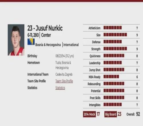 通过球探报告可以看出,努尔基奇在新秀期展现出的潜力就是低位杀器,球商高,篮板能力强,但弹跳能力和爆发力不足,同时防守存在短板,他在进入NBA后就需要重点解决这些问题。