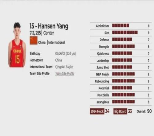我们现在以上帝视角来看,小杨的篮板和防守评分明显被高估了,以他目前的篮板表现被评6分都不为过,而在NBA Ready(NBA准备)方面也被高估了,他英语进步幅度不大,对NBA节奏不适应,体能储备不足等都是没做好NBA准备的表现,所以除了Intangibles(无形资产,巨大的中国市场带来经济效益)他确实领先外,其他方面全面落后。