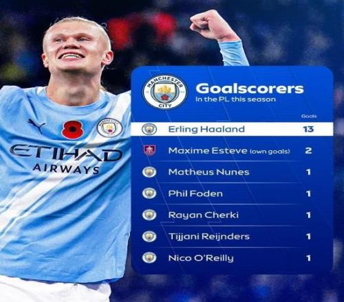 根据统计,本赛季到目前为止,哈兰德在英超联赛中已经打进了13个进球,是曼城队内联赛进球最多的,而他们进球第二多的是乌龙球,而且都是伯恩利后卫埃斯泰夫打进的,其他球员都只打进了1球。
