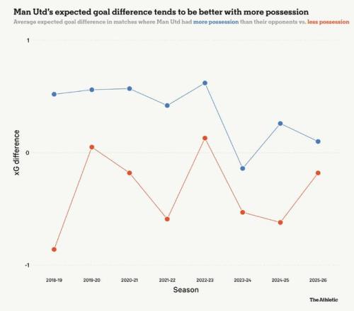 这一趋势可以追溯到本赛季之前,甚至在阿莫林于2024年11月开始执教老特拉福德之前。在曼联近年来的历史中,已有多个赛季显示,当球队在比赛中没有占据控球主导权时,他们在英超联赛中反而取得了更多的成功。