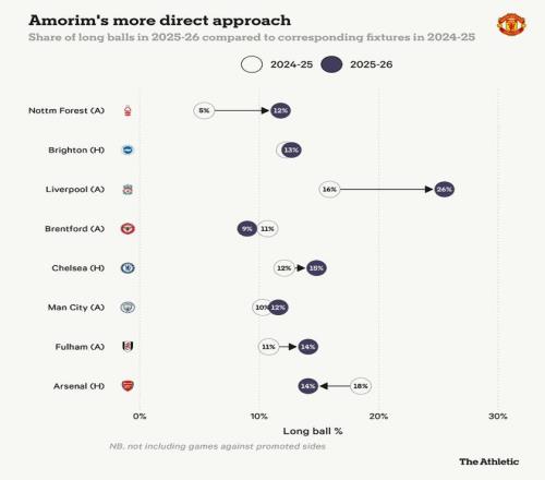 在整个赛季中,保持适当的防守结构将是这种风格的关键。曼联在长传进攻时表现不错,但在防守长传时也显得脆弱(这是阿莫林上任前就长期存在的另一个问题)。