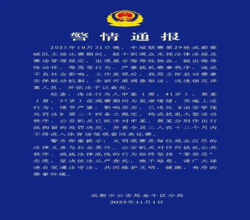 11月1日,成都市公安局金牛区分局发布警情通报:违法行为人申某(男,41岁)、黄某(男,37岁)已被依法作出行政拘留的处罚决定,并责令其二人在十二个月内不得进入体育场馆观看同类比赛。